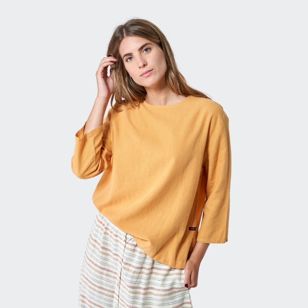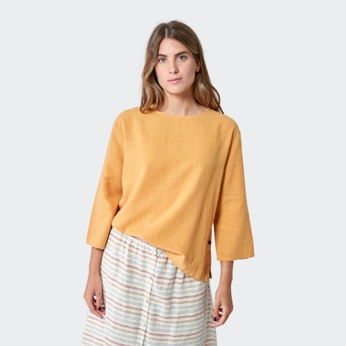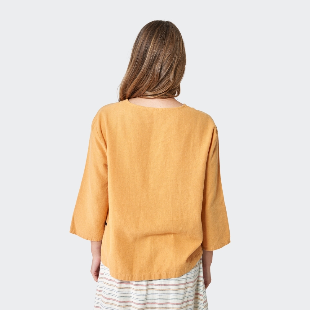 Camisa o blusa para mujer confeccionada en lino con cuello barco y manga ancha 3/4. Tiene aberturas laterales en el bajo para mayor comodidad. Una prenda ideal para climas templados o como transición entre estaciones.