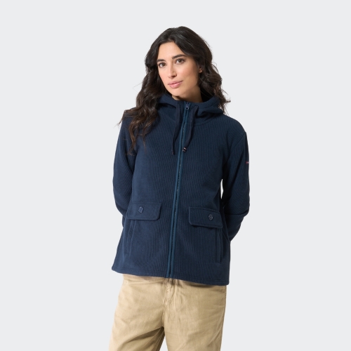 Chaqueta funcional y versátil con un diseño urbano de inspiración náutica. Cuenta con capucha ajustable mediante cordones y un corte regular fit que ofrece comodidad sin perder estilo. En el delantero, incluye dos bolsillos con solapas decorativas adornadas con grandes botones de ancla cosidos con hilo tono sobre tono, que aportan un toque distintivo. Los puños elásticos garantizan un ajuste cómodo, y el cierre frontal con cremallera.