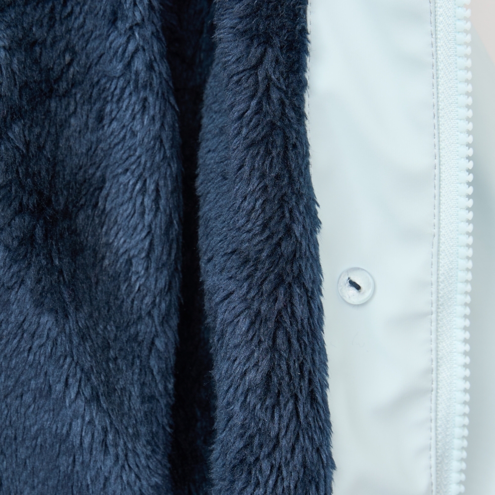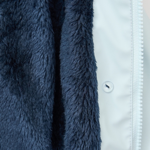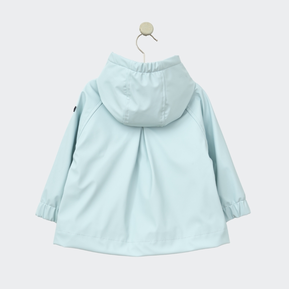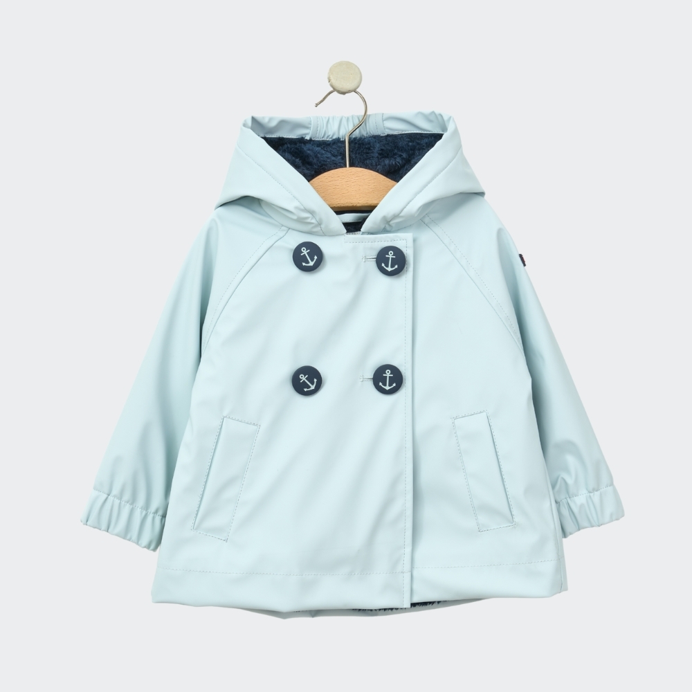 Chubasquero para bebé que combina funcionalidad y estilo náutico. Confeccionado en tejido impermeable de poliuretano y forrado en suave pelo interior, mantiene al bebé abrigado y protegido en los días lluviosos. Presenta un corte acampanado con pliegue en la espalda, que aporta libertad de movimiento y un toque distintivo al diseño. El cierre frontal combina cremallera oculta y cuatro botones decorativos con forma de ancla en el pecho, aportando un aire marinero muy especial. Las mangas llevan bajo elástico para evitar la entrada de agua, y cuenta con dos bolsillos ribeteados en la parte delantera, prácticos y decorativos.