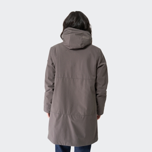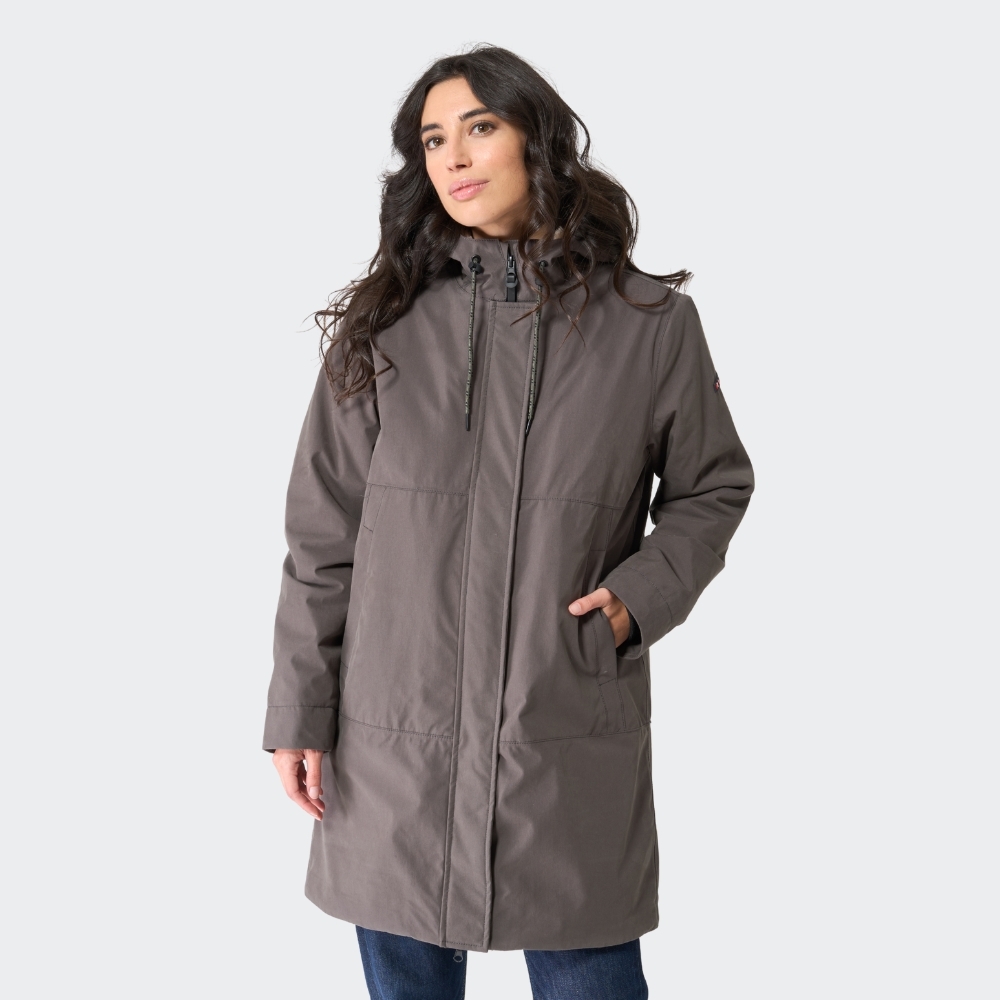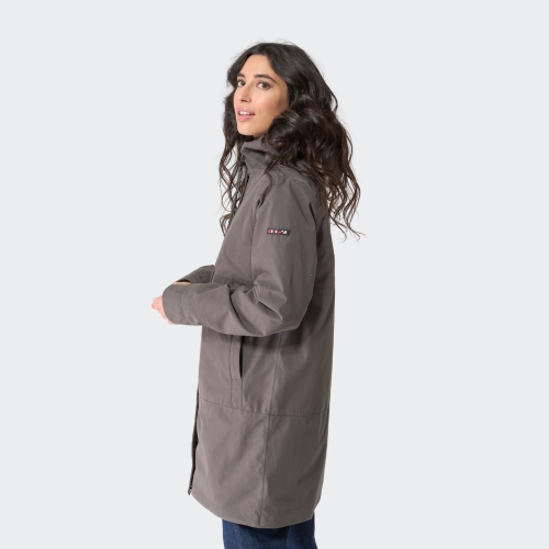 Abrigo de mujer 100% impermeable con capucha y forro interior de borreguito. Cierre frontal con cremallera de doble cursor, que se oculta con una tapeta cerrada con corchetes. Esta es una prenda exterior perfecta para usarla tanto como abrigo, como para la lluvia.