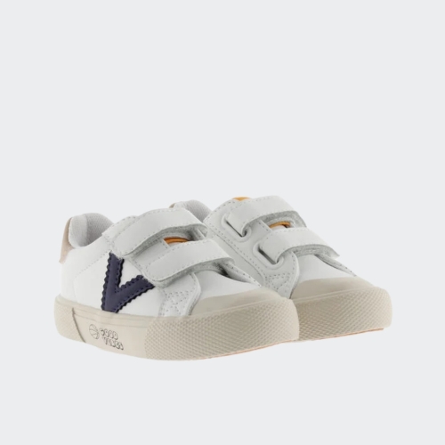 Zapatillas deportivas blancas para niños con detalles de color en el logo, etiqueta y pieza trasera. Cierre mediante dos tiras adherentes para una mejor sujeción y facilitar el calce. Suela tostada y puntera de goma que las hace más resistentes y duraderas. Llevan plantilla de alta densidad para un mayor confort.