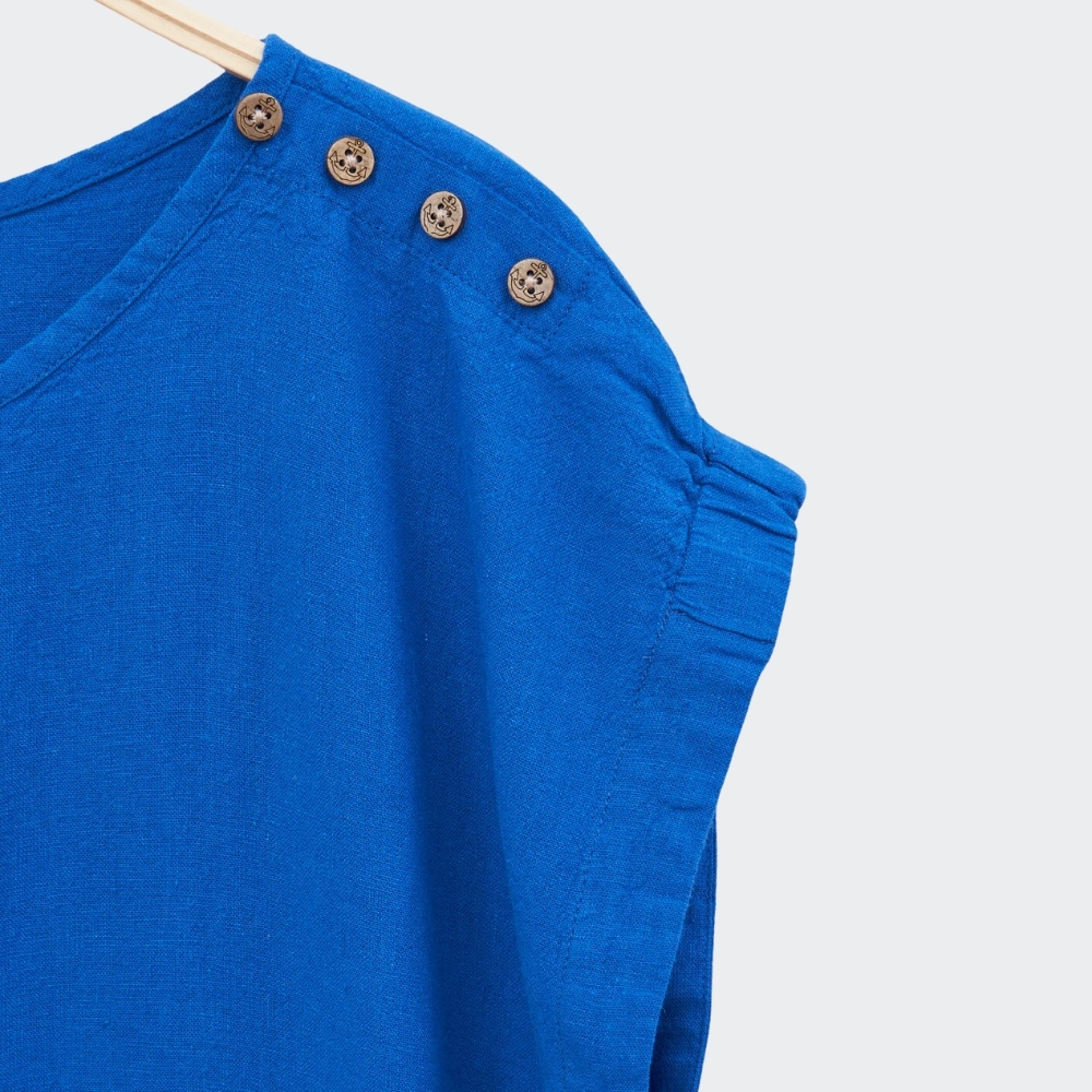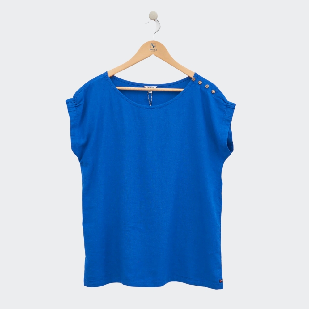Camiseta a rayas o estampada confeccionada en lino y viscosa con detalles únicos Redefine el estilo clásico con esta camiseta de mujer, confeccionada en una mezcla de lino y viscosa para una frescura inigualable. El fruncido en las mangas aporta un aire refinado y contemporáneo, mientras que los botones decorativos en el hombro realzan el diseño con un toque de distinción. Ideal para aquellas que buscan una mezcla armoniosa de comodidad y sofisticación.