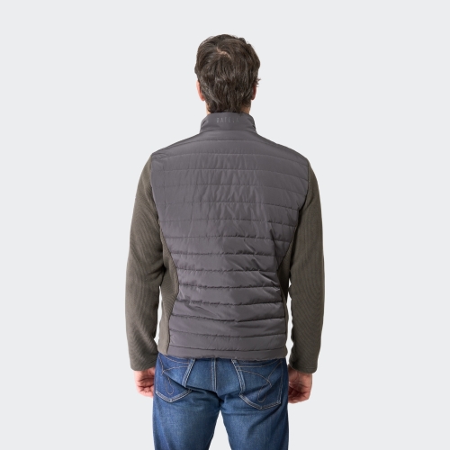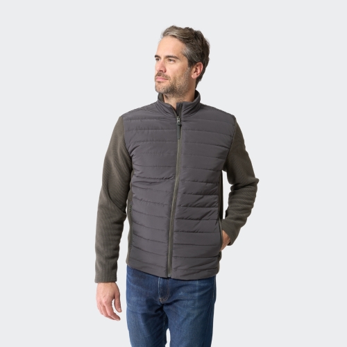 Chaqueta para hombre con cuello recto, diseñada con un atractivo mix de tejidos que combina estilo y funcionalidad. Las mangas y los paneles laterales están confeccionados en tejido polar texturizado, cálido y suave al tacto, mientras que el delantero y trasero presentan un acabado en nylon estilo plumífero, que aporta ligereza y un look técnico. Incluye dos bolsillos discretamente integrados en los cortes frontales y cierre delantero con cremallera, que refuerzan su carácter práctico y urbano.