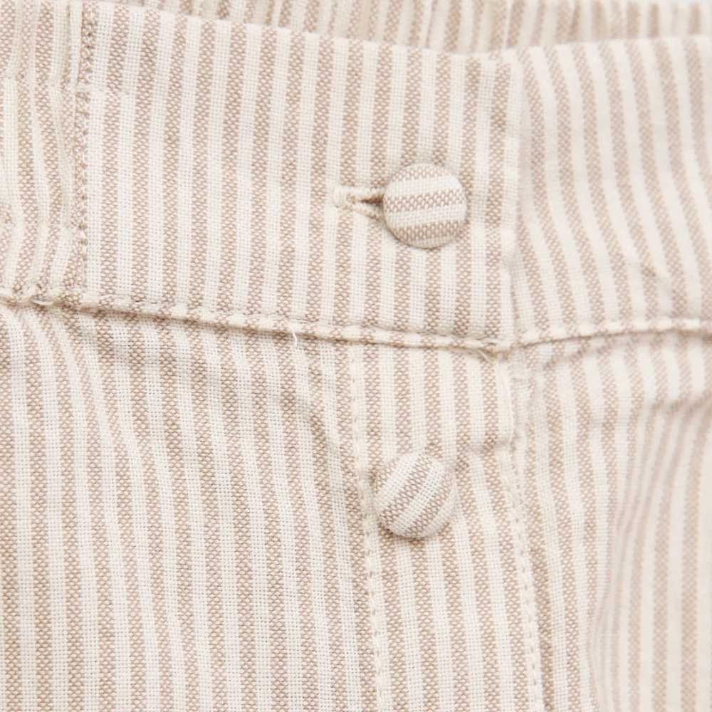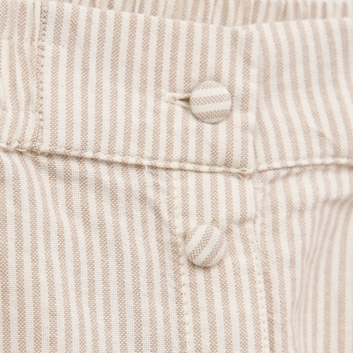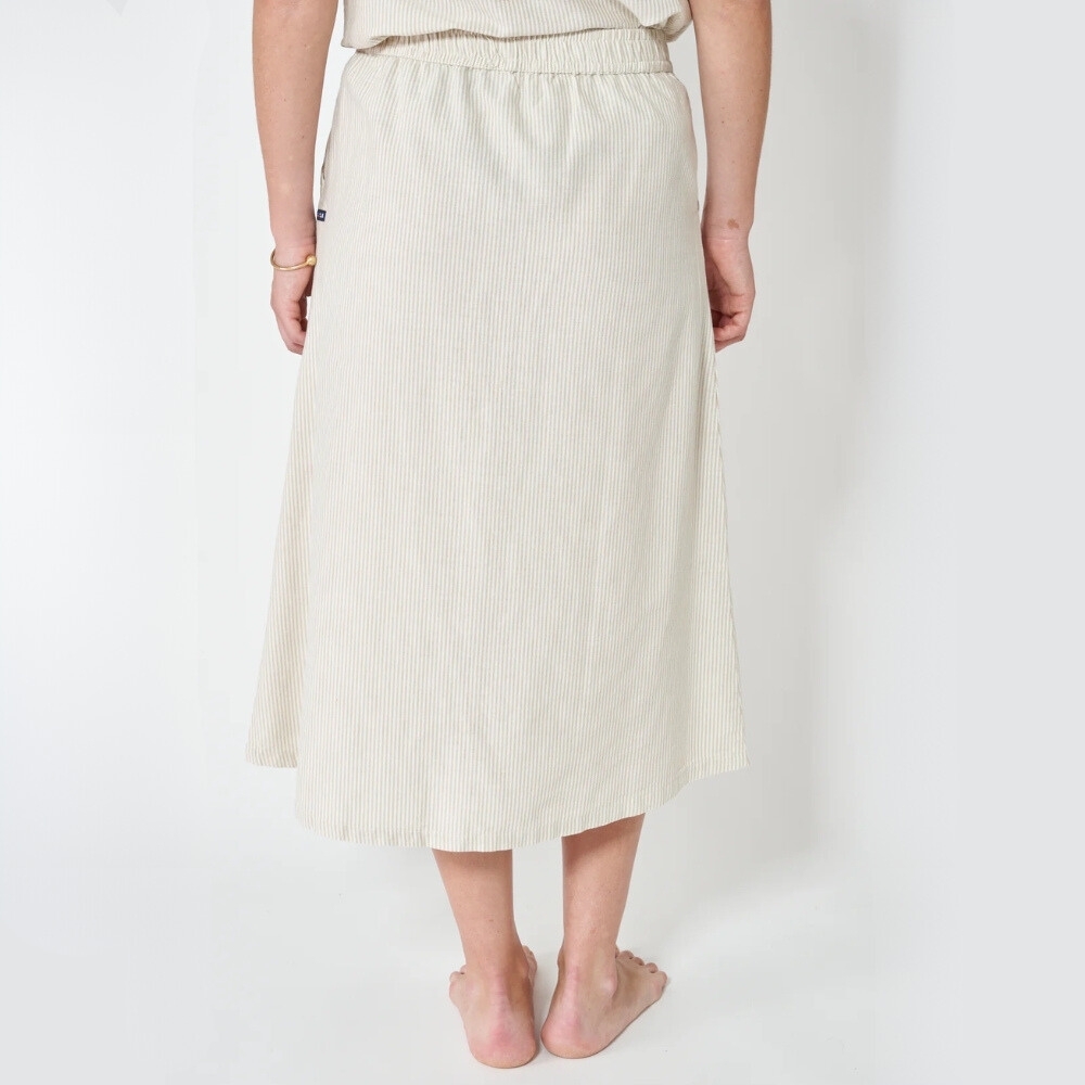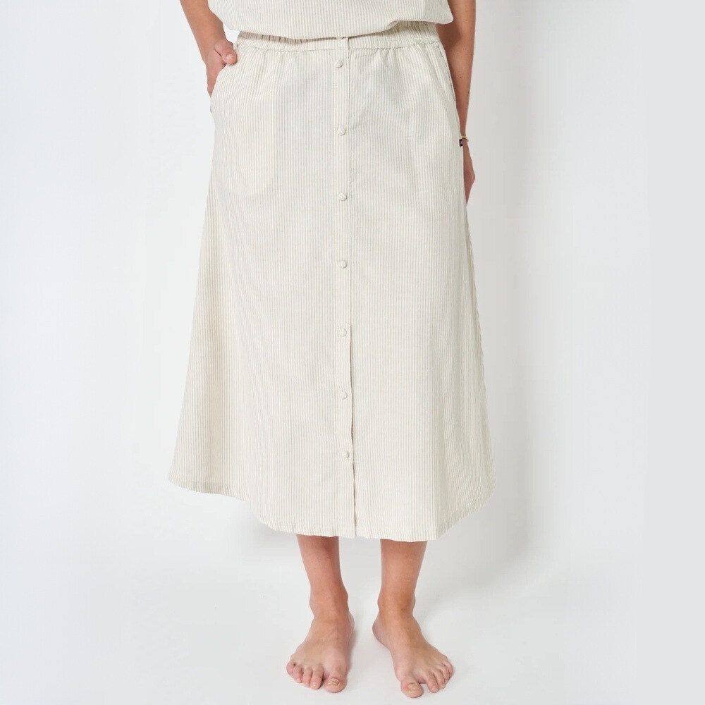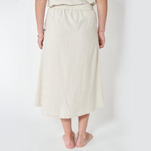 Falda larga de hilo teñido a rayas con botones y bolsillos laterales: estilo y comodidad Esta falda larga, elaborada con hilo teñido a rayas, es una pieza única que combina estilo y comodidad. Su diseño incluye botones para una apertura frontal elegante y práctica, además de bolsillos laterales que añaden funcionalidad al conjunto.