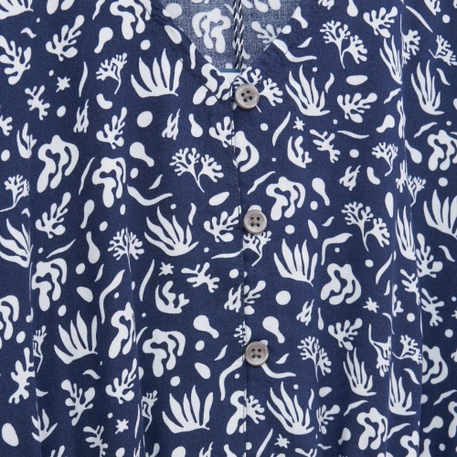Explora la elegancia marina: Vestido en viscosa con estampados marinos Este vestido de viscosa con estampado marino, disponible en diseños de corales y conchas, combina la ligereza del tejido con un estilo náutico encantador. El cordón de ajuste en la cintura permite una silueta personalizable, mientras que los estampados añaden un toque de naturaleza marina.