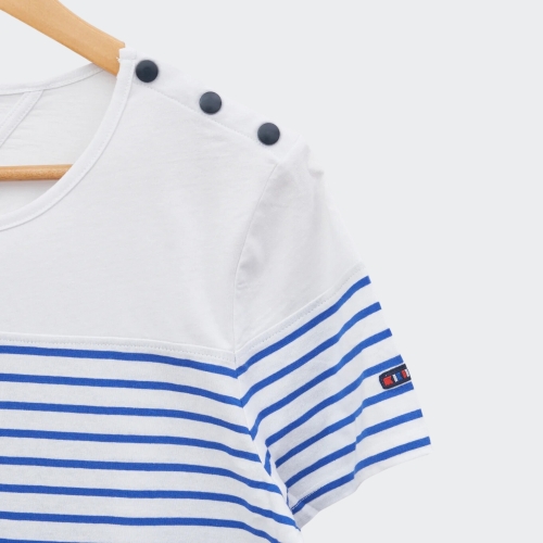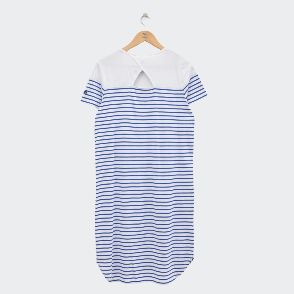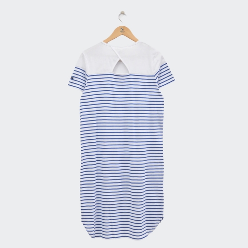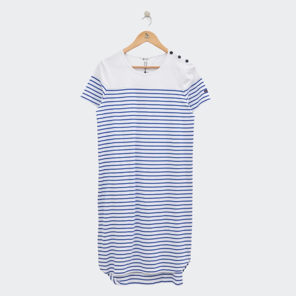 Vestido a rayas y liso con botones en hombro en algodón 180 gr. Este elegante vestido combina las rayas con el panel liso en cuello y hombros, confeccionado en algodón de 180 gr para una calidad superior. Los botones en el hombro añaden un detalle sofisticado y contemporáneo, mientras que su diseño equilibrado lo hace ideal tanto para ocasiones casuales como más formales.