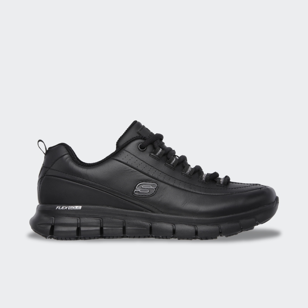 Deja que el confort de todo el día fluya con la zapatilla SKECHERS Work ™Relaxed Fit®: Sure Track - Trickel. Modelo de trabajo con cordones con parte superior de piel lisa, plantilla con amortiguación Skechers Memory Foam™ y suela antideslizante.