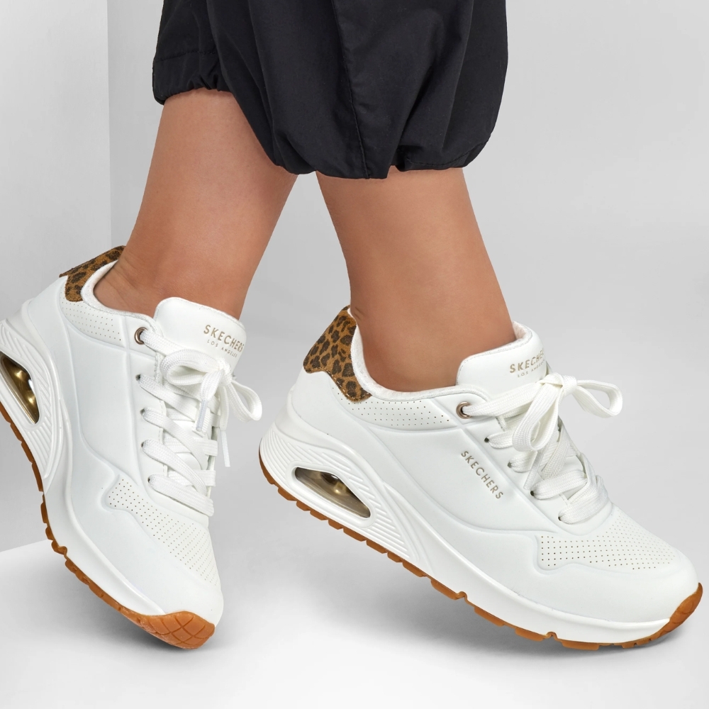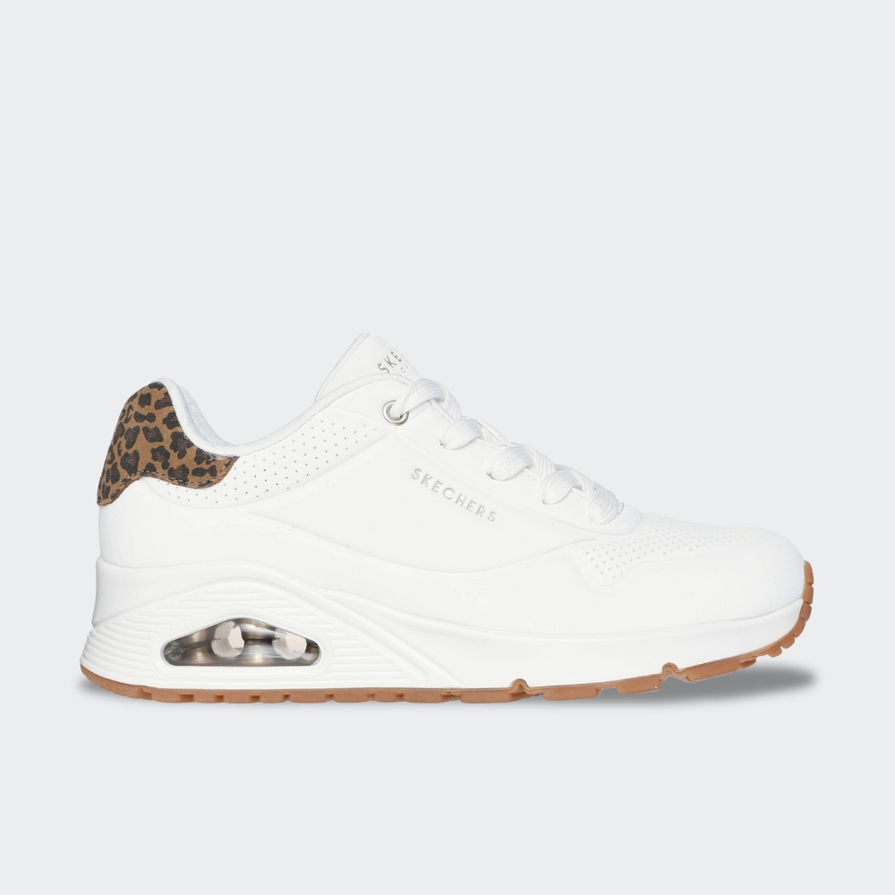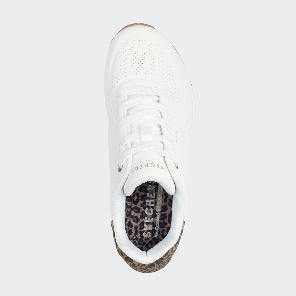 Anda sobre las nubes con la salvaje comodidad de las Skechers Street™ Uno - Jungle Nite. Esta moderna zapatilla con cordones presenta una parte superior de material sintético, talonera con estampado de leopardo, una plantilla Skechers Air-Cooled Memory Foam™ y una media suela visible Skech-Air® con cámara de aire.