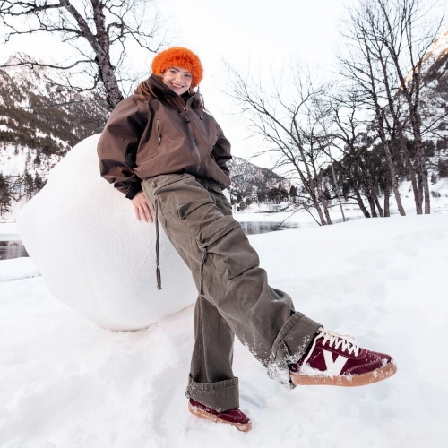 V del lateral y pieza trasera en efecto piel blanca, y pespuntes también blancos. Cierre mediante cordones blancos y nuevo corte ciclista en la puntera. Su suela traslúcida color caramelo aporta un toque de estilo retro. Además, incluyen una plantilla más ergonómica, confeccionada a partir de materiales reciclados, proporcionando un confort superior en cada paso.