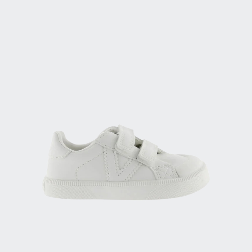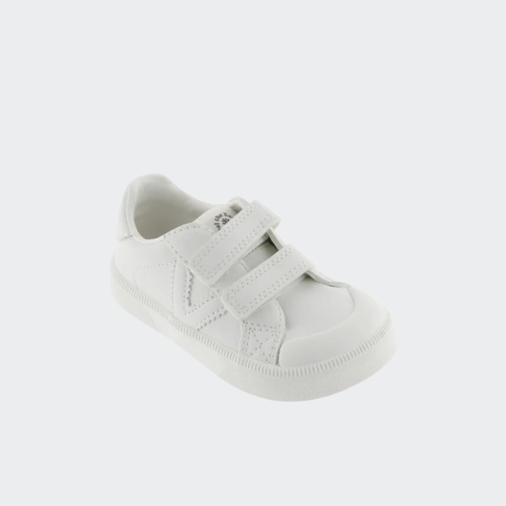 Zapatillas deportivas barefoot para niños fabricadas en material efecto piel. Cierre mediante dos tiras adherentes, tres a partir de la talla 36, que facilitan el calce y aportan sujección.