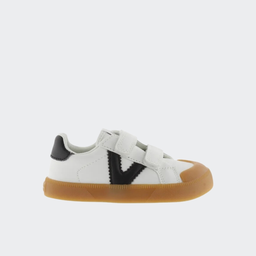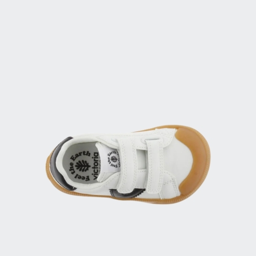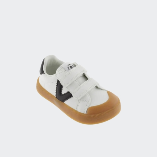 Zapatillas deportivas barefoot para niños fabricadas en material efecto piel. V del lateral y pieza trasera en color negro en contraste. Cierre mediante dos tiras adherentes, tres a partir de la talla 36, que facilitan el calce y aportan sujección. Suela de goma en color caramelo.