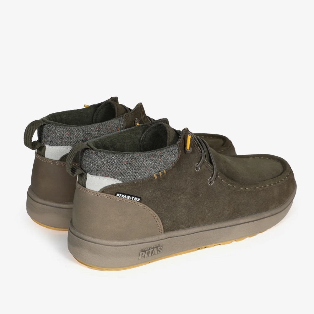 Corte en serraje hidrofugado repelente al agua con talonera de PU nobuck.